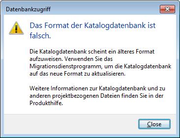 Sie können die Katalogdatenbank durch Hinzufügen von Tabellen sowie durch Hinzufügen und Bearbeiten von Datensätzen anpassen. Einige Änderungen bewirken jedoch, dass das Programm die Katalogdatenbank nicht mehr verwenden kann. In diesem Fall sehen Sie die folgende Warnung.