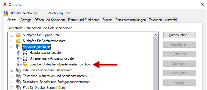 Benutzerprofile umfassen auch die Speicherorte, in denen das Programm nach Support-, Treiber-, Anpassungsdateien und anderen Dateien sucht. Wenn Ihre benutzerdefinierten Dateien nicht an den vorgabemäßigen Speicherorten abgelegt sind, werden die Pfade zu diesen Speicherorten migriert, die benutzerdefinierten Dateien selbst jedoch nicht. Migrieren Sie Ihre benutzerdefinierten Dateien mit den Optionen im Dienstprogramm Benutzerdefinierte Einstellungen migrieren, oder kopieren Sie die Dateien manuell zwischen den Speicherorten der früheren und der aktuellen Version des Programms.