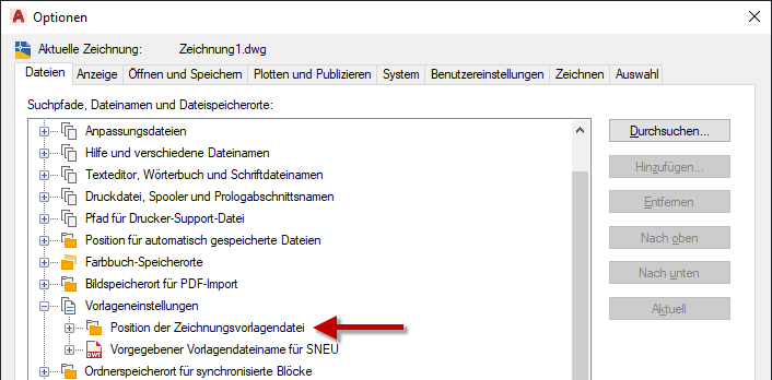 Zeichnungsvorlagendatei (DWT) werden zum Erstellen neuer Zeichnungen verwendet. Die anhand einer DWT-Datei erstellten Zeichnungen enthalten alle Stile und Zeichnungsobjekte, die in der DWT-Datei definiert sind. Die benutzerdefinierten DWT-Dateien aus der früheren Version werden in einen Unterordner mit dem Namen der Zielversion migriert; die Namenskonvention des Unterordners lautet Produktname Templates. Der Unterordner Produktname Templates wird unter dem Ordner erstellt, der in der Einstellung Position der Zeichnungsvorlagendatei definiert ist.
