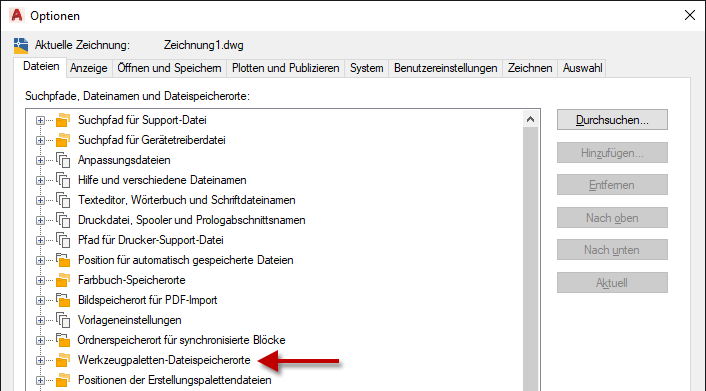 Werkzeugpalettendateien enthalten standardmäßige und benutzerdefinierte Werkzeuge. Die Dateien sind an den Speicherorten abgelegt, die von der Einstellung Werkzeugpaletten-Dateispeicherorte angegeben werden.