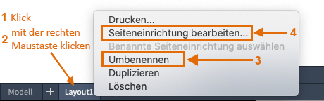 Als Erstes sollten Sie beim Zugriff auf die Registerkarte Layout (1) mit der rechten Maustaste auf die Registerkarte (2) klicken und ihr einen aussagekräftigeren Namen (3) als "Layout 1" geben. Namen, die eine bestimmte ANSI- oder ISO-Größe referenzieren, sind häufig eine gute Wahl.