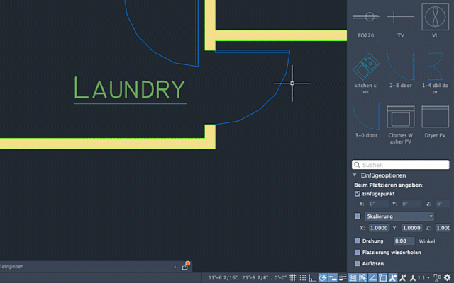 Anmerkung: Wenn das Kontrollkästchen Skalierung oder Drehung aktiviert ist, werden die zuletzt eingegebenen Werte verwendet, wenn Sie einen Block zum Einfügen ziehen. Sie werden nicht zur Eingabe der Skalierung oder Drehung aufgefordert.