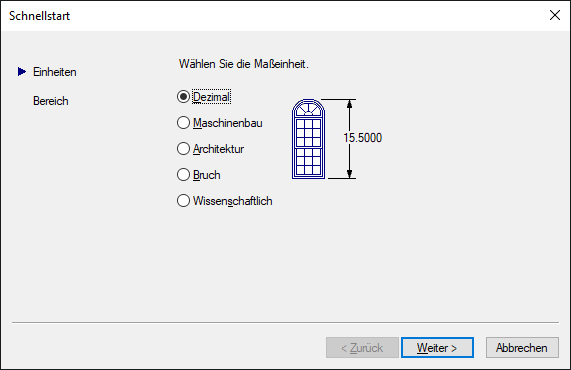 Der Schnellstart-Assistent umfasst zwei Seiten: Mit den Optionen Zurück und Weiter wechseln Sie zwischen den einzelnen Seiten, mit Fertig stellen auf der letzten Seite schließen Sie den Assistenten und lassen die neue Zeichnung mit den festgelegten Einstellungen anlegen.