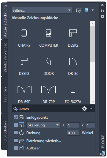 - Ziehen Sie einen Block in die aktuelle Zeichnung, um ihn schnell zu platzieren. Bei dieser Methode werden nur die unter Optionen angegebenen Werte für Skalierung und Drehung verwendet.