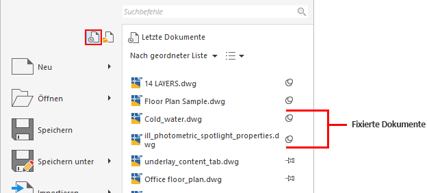 Dateien werden in der Liste Letzte Dokumente angezeigt, wobei die zuletzt geöffnete Datei vorgabemäßig ganz oben steht.