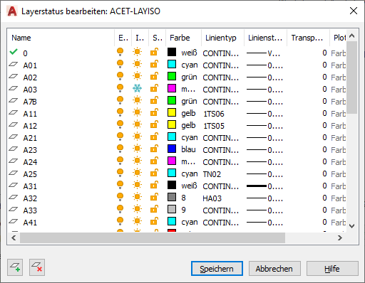 Zeigt eine Liste der Layer des ausgewählten Layerstatus und ihre Eigenschaften an.