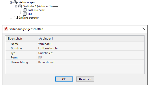 Geben Sie einen Verbindungstyp an und ändern Sie ggf. die Strömungsrichtung. Weitere Informationen finden Sie unter "Verbinder eines parametrischen Bauteils" und "Hinzufügen von Verbindungsteilen zu einem parametrischen MV-Bauteil".