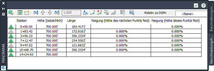 Der Höheneditor in Abbildung 1 zeigt die Höhen für die quadratischen Elementkanten an, die an den Stellen, an denen diese Kanten die anderen Elementkanten kreuzen, zwei Teilungspunkte aufweisen. Im Höheneditor wird in der ersten Spalte für Punkte, an denen sich zwei Elementkanten schneiden, neben dem Punktsymbol ein Pluszeichen (+) angezeigt.
