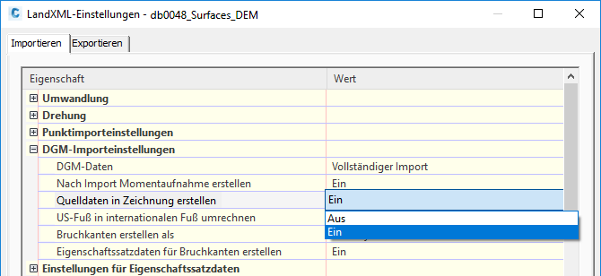 Abbildung 2: LandXML-Einstellungen für den DGM-Import