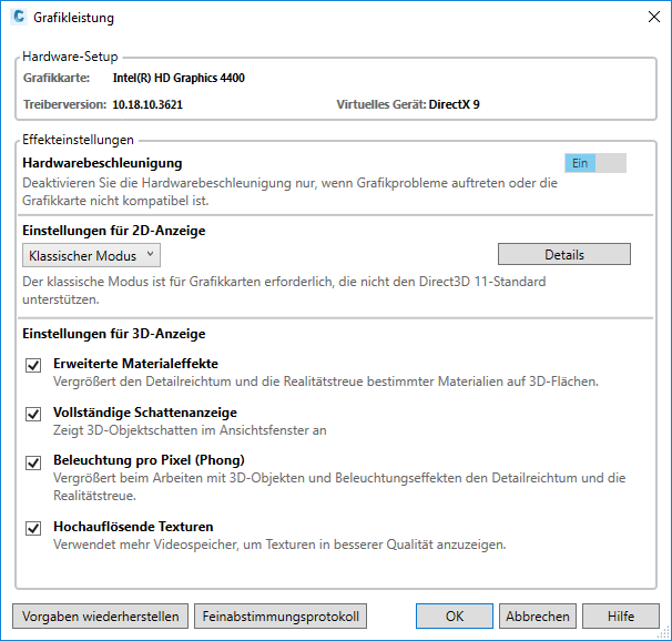 Außerdem können Sie durch Eingabe des Befehls -GRAFIKKONFIG in der Befehlszeile auf weitere Optionen zugreifen. Weitere Informationen erhalten Sie in der AutoCAD-Hilfe.