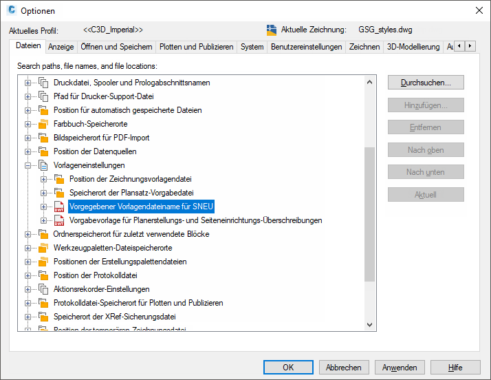 Wenn Sie Autodesk Civil 3D mit dem britischen Profil starten, ist die Standardvorlage für eine neue Zeichnung _Autodesk Civil 3D (Imperial) NCS.dwt. Wenn Sie Autodesk Civil 3D mit dem metrischen Profil starten, ist die Standardvorlage für eine neue Zeichnung _Autodesk Civil 3D (Metric) NCS.dwt. Die Standardvorlage wird angewendet, wenn Sie Autodesk Civil 3D starten oder eine neue Zeichnung (Befehl SNEU) erstellen. Sie können jedoch eine andere Standardvorlage angeben, die Ihren Anforderungen besser entspricht.