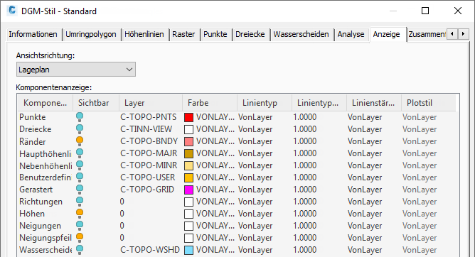 Im Dialogfeld DGM-Stil - Existing Ground Contours ist die Sichtbarkeit der Komponenten Rand, Haupthöhenlinie und Nebenhöhenlinie aktiviert. Diese Komponenten bestimmen, wie das DGM in der Zeichnung angezeigt wird. Bei Aktivierung der Komponenten wird das DGM wie in Abbildung 6 dargestellt.