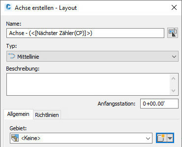 Wenn Sie in den Dialogfeldern Achse erstellen oder Achse erstellen - Aus Polylinie eine Achse erstellen, wird standardmäßig eine Achse ohne festgelegtes Gebiet (<Keine>) erstellt (siehe Abbildung 2).