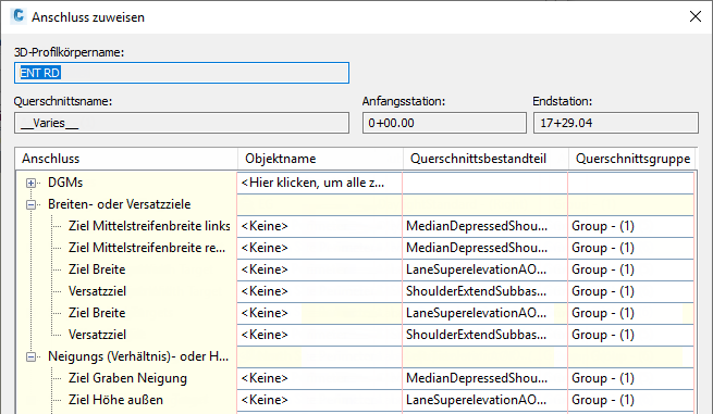 Mit Autodesk Civil 3D können Sie eine Reihe von Elementen in 3D-Profilkörpermodellen als Ziele definieren, so z. B. Elementkanten, die in Gebietsverschneidungen eine Hauptkomponente darstellen. Dies bedeutet, dass Sie 3D-Profilkörpermodelle und Gebietsverschneidungen integrieren können, sodass sie miteinander interagieren. Mithilfe mehrerer Ziele können Sie Verbindungen zu verschiedenen Komponenten der Gebietsverschneidung erstellen, ohne Zeit mit dem Erstellen von komplexen Achsen und Längsschnitten verbringen zu müssen.