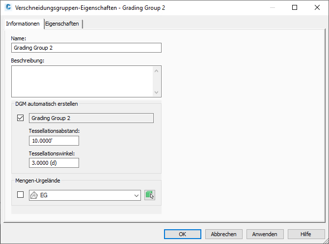 Um das Problem mit der Bogentriangulation zu beheben, müssen Sie für den Tessellationsabstand der Verschneidungsgruppe einen kleineren Wert festlegen. Wie in Abbildung 26 zu sehen ist, ist es möglicherweise schwierig, im Dialogfeld Verschneidungsgruppen-Eigenschaften das Feld für die Eingabe des Tessellationsabstands zu finden, da dieser Wert nur eingegeben werden kann, wenn die Option DGM automatisch erstellen aktiviert ist. Diese Einstellung wird jedoch auch für den Befehl Losgelöstes DGM erstellen sowie für die Triangulation der Flächenverschneidung verwendet. Die beste Lösung für diese Situation ist, die Option DGM automatisch erstellen zu aktivieren, den Standardwert für den Tessellationsabstand von 10 Fuß in 1 Fuß zu ändern und die Option DGM automatisch erstellen wieder zu deaktivieren. Nach dem Aktivieren der Option DGM automatisch erstellen müssen Sie auf Anwenden klicken, um die geänderten Einstellungen anzuwenden.