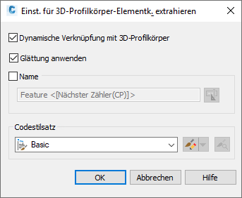 Ein optimales Verfahren ist, im Dialogfeld Einst. für 3D-Profilkörper-Elementk. extrahieren die Option Dynamische Verknüpfung zu aktivieren (siehe Abbildung 35), sodass in diesem Beispiel alle Aktualisierungen des 3D-Profilkörpers auch auf die Verschneidung in diesem Bereich angewendet werden. Außerdem sind Einstellungen zum Glätten vorhanden, um die Bildung der Elementkante um einen geschwungenen Bereich herum zu steuern. Weitere Informationen finden Sie unter Elementkantenglättung.