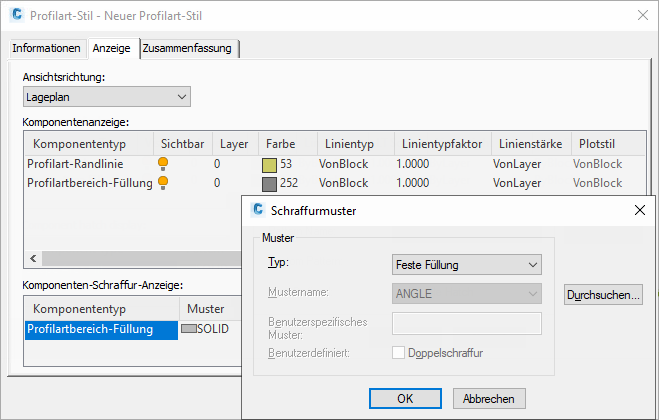 Beim Entwerfen von 3D-Profilkörpern können Sie effizientere Querschnittsbestandteile erstellen, wenn Sie sicherstellen, dass der Profilart-Stil ohne Füllung oder zumindest mit einer festen Füllung anstelle von Schraffurmustern definiert ist. Abbildung 2 zeigt das Dialogfeld Profilart-Stil, in dem Sie einen Profilart-Stil für einen Querschnittsbestandteil definieren können.