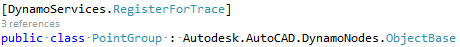 Autodesk.Civil.DatabaseServices.PointGroup definiert eine Punktgruppe in Civil 3D, die von Autodesk.AutoCAD.DatabaseServices.Object abgeleitet ist. Eine neue Klasse namens PointGroup, abgeleitet von Autodesk.AutoCAD.DynamoNodes.Objectbase, muss erstellt werden, um den Civil 3D-Punktgruppentyp zu umschließen. Das Attribut DynamoServices.RegisterForTrace kann zur Klasse PointGroup hinzugefügt werden, um einen Verfolgungsmechanismus umzusetzen. Dies ist nicht erforderlich, da Dynamo vorgabemäßig Unterstützung dafür bietet. Allerdings ist es eine übliche Coding-Praxis.