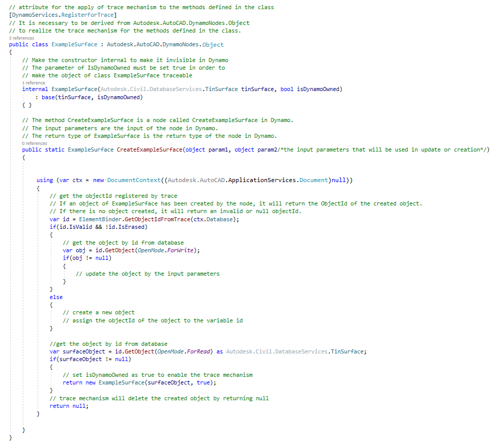 Mithilfe der folgenden Vorlage können Sie Verfolgungscode schreiben. Die Klasse für neue Blöcke muss jedoch trotzdem Autodesk.AutoCAD.DynamoNodes.Object oder Autodesk.AutoCAD.DynamoNodes.Entity übernehmen.