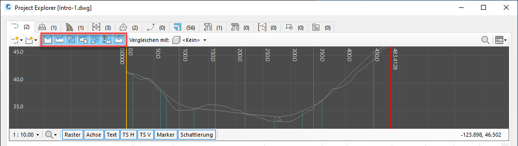 Der vertikale Überhöhungswert sowie die Einstellungen zum Ein-/Ausblenden für die einzelnen visuellen Komponenten eines bestimmten Höhen- oder Querprofilplans können auch über die zugehörigen Ansichtssteuerelemente im Project Explorer-Hauptfenster gesteuert werden, wie unten angegeben.