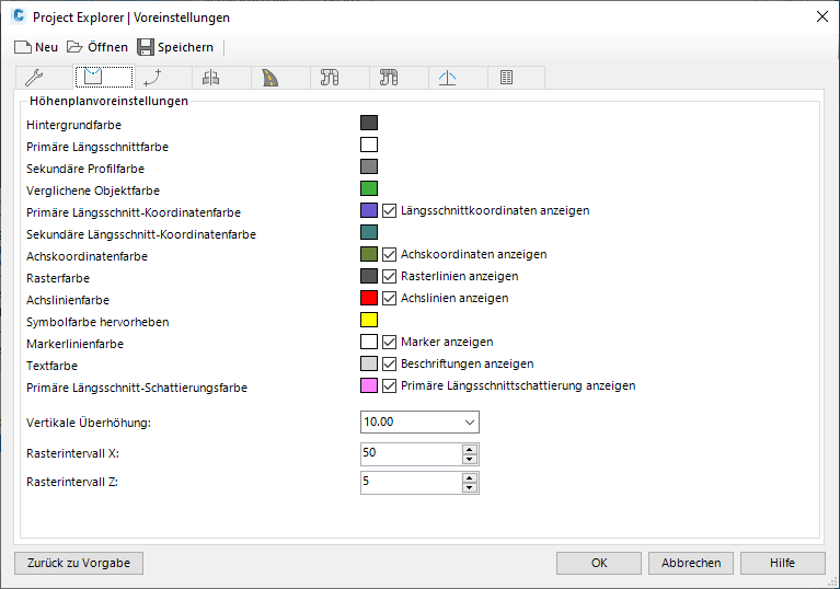 Über die übrigen fünf Registerkarten im Fenster Voreinstellungen in Project Explorer steuern Sie die Farb-, Stil-, Raster- und Skalierungseinstellungen der verschiedenen Höhen- und Querprofilpläne im Project Explorer-Hauptfenster.