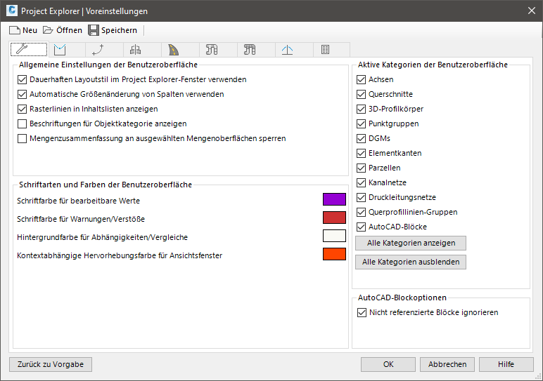 Voreinstellungen bestimmen alle Aspekte der Benutzeroberfläche von Project Explorer, die für die Erstellung von Berichten nicht relevant ist. Beispiele: Farbschemata und Vorgabe-Maßstabseinstellungen für Höhen- und Querprofilpläne, Schriftarteinstellungen für die Benutzeroberfläche sowie Sichtbarkeit und Bereichslayout der einzelnen Objektkategorie-Registerkarten im Project Explorer-Fenster.