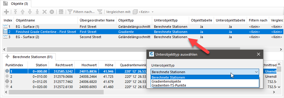 Für einige Civil 3D-Objekttypen gibt es mehrere verfügbare Unterobjekttypen für ein aufgelistetes Objektsatzelement. Für Achsen ist es beispielsweise möglich, einen Bericht zu erstellen, der berechnete Stationen, Achsobjekte, Achs-TS-Punkte oder kritische Querneigungsstationen enthält.