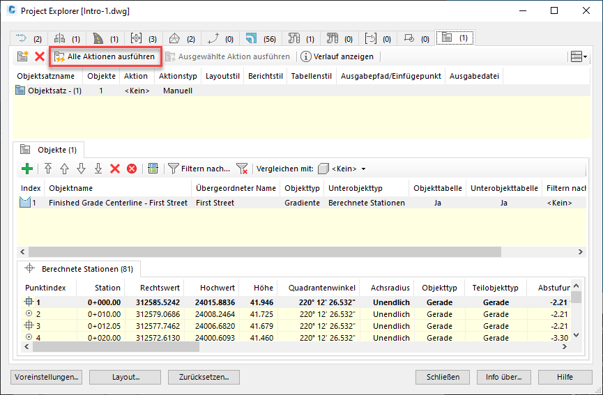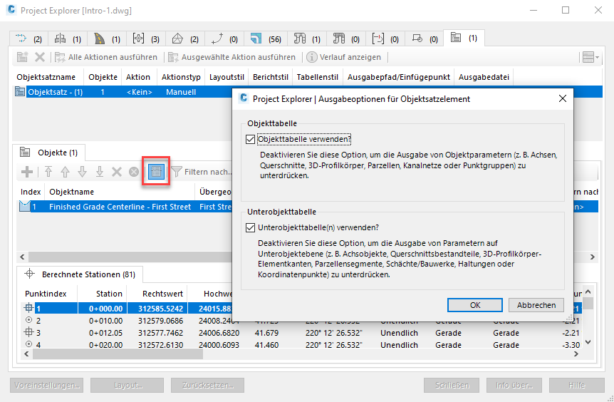 Ein Objektsatz ist eine vom Benutzer definierbare Liste von Civil 3D-Objekten, der Sie eine Aktion und andere zugehörige Details zuweisen können. Aktionen können manuell oder in einigen Fällen dynamisch ausgelöst werden, wenn Project Explorer feststellt, dass eine abhängige Komponente in Ihrem Entwurf geändert wurde. Objektsätze dienen in der Regel zur Automatisierung der Erstellung vorkonfigurierter Berichte, Tabellen, AutoCAD-Zeichnungen oder AutoCAD-Tabellen. Die genau erforderliche Kombination von Stilen, Filtern und Ausgabeanweisungen hängt vom Aktionstyp und Objekt ab, die zugewiesen werden.