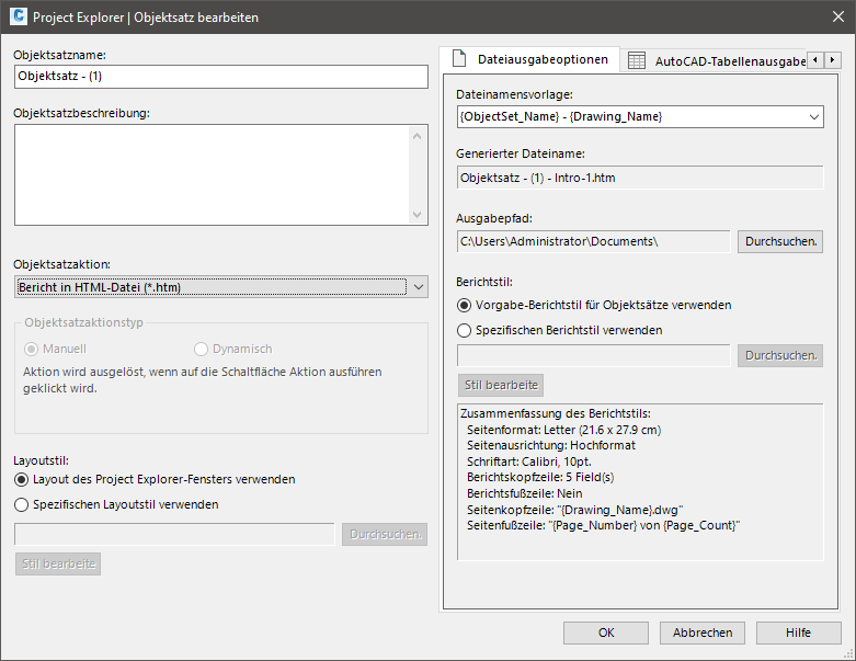 Bei Verwendung der Aktion Bericht erstellen muss dem Objektsatz ein Layoutstil zugewiesen werden. Dieser Layoutstil bestimmt das Layout und die Formatierung des Inhalts im erzeugten Bericht.