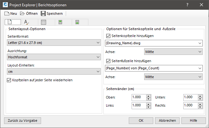 Berichtsoptionen bestimmen die Einstellungen für Seitenformat, Seitenausrichtung, Seitenränder, Berichtkopfzeile sowie Seitenkopf- und -fußzeilen für alle Berichte und Tabellen, die in Project Explorer erstellt wurden.