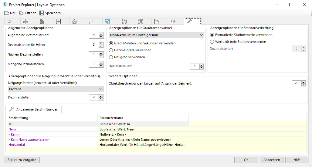 Layout-Optionen bestimmen das Layout, das Format, den Überschriftennamen und die Sichtbarkeit von Datenspalten und -werten in der Project Explorer-Benutzeroberfläche sowie in generierten Berichten, Arbeitsblättern und AutoCAD-Tabellen.