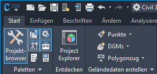 Nach Abschluss der Installation kann über die Registerkarte Start der Hauptmultifunktionsleiste von Autodesk Civil 3D auf das Project Explorer-Fenster zugegriffen werden.