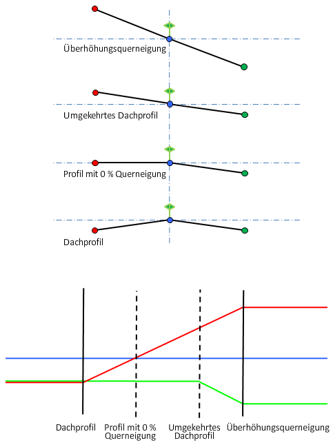 In der folgenden Abbildung wird die Drehpunktmethode Basislinie zentriert für eine baulich nicht getrennte Straße mit Dachprofil gezeigt.