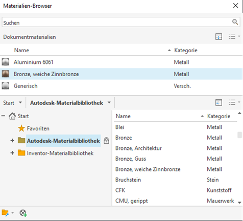 Im Material-Browser werden Materialien gesucht und verwaltet. Allgemeine Funktionen: