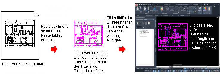 Das Bild im folgenden Beispiel wurde mit einem Papiermaßstab von 1:48 gezeichnet, bei 300 dpi gescannt und dann mit einem Auflösungswert von 300 und der Auflösungseinheit Zoll in die Zeichnung eingefügt. Anschließend wurde das Bild auf der Grundlage des Papiermaßstabs von 1:48 skaliert.