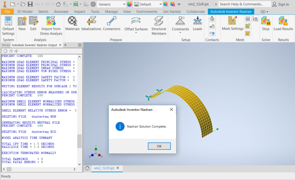 - Klicken Sie auf der Autodesk Inventor Nastran ribbon auf die Schaltfläche Ausführen, um das Modell auszuführen. Der Autodesk Inventor Nastran-Solver sollte ohne Fehler oder Warnmeldungen abschließen, wie in der Abbildung unten gezeigt: