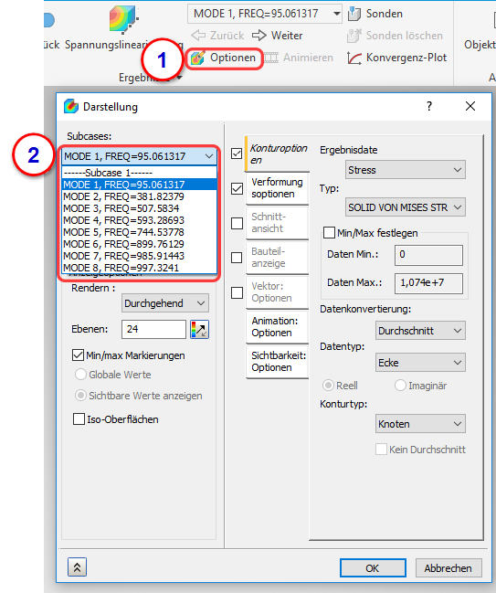 - Öffnen Sie das Menü Subcases. Die Frequenzen für die einzelnen Modi sind hier aufgeführt: