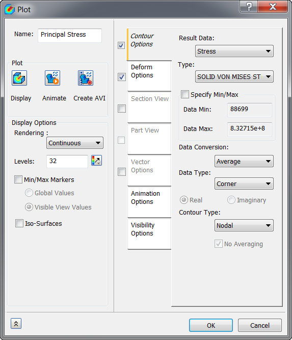 Nehmen Sie Änderungen vor, damit das Dialogfeld der folgenden Abbildung entspricht. Ändern Sie den Namen in Principal Stress. Deaktivieren Sie die Option Min/Max Markierungen, ändern Sie die Dropdown-Liste Ergebnisdaten in Spannung, wählen Sie einen Typ, z. B. VOLUMENKÖRPER VON MISES-SPANNUNG, und deaktivieren Sie dann auf der Registerkarte "Sichtbarkeitsoptionen" Elementkanten.