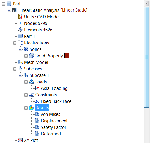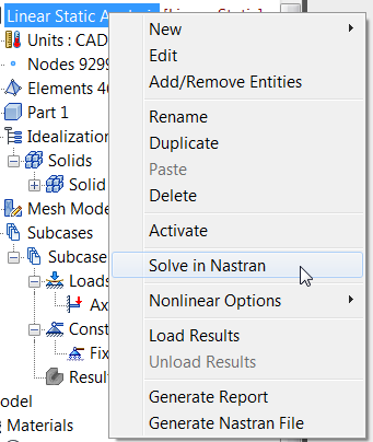 - Klicken Sie in der Strukturansicht mit der rechten Maustaste auf Linear Static Analysis, und wählen Sie Lösen in NASTRAN.