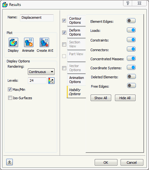 - Klicken Sie nun mit der rechten Maustaste auf Verschiebung, und wählen Sie Bearbeiten. Wählen Sie die Registerkarte Sichtbarkeitsoptionen und setzen Sie die Schaltfläche Elementkanten auf AUS. Klicken Sie auf OK.