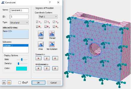 strCmdForConstraint = "<Constraint Name=""Constraint 1"" ID=""1"" Type=""0"" CoordinateSystemID=""0"" Tx=""1"" Ty=""1"" Tz=""1"" Rx=""1"" Ry=""1"" Rz=""1"" EntitiesCount=""1"" ArrowLength=""50"" ArrowColor=""14803200"" DisplayDensity=""4"" SubcaseCount=""1"" Subcases=""1""><Entity1 GeometryType=""2"" GeometryID=""13"" ComponentName=""Tutorial 1""/></Constraint>"