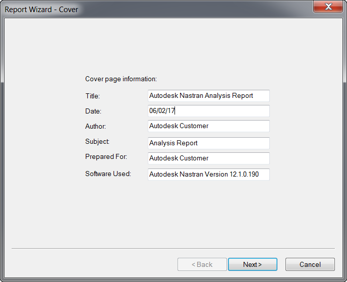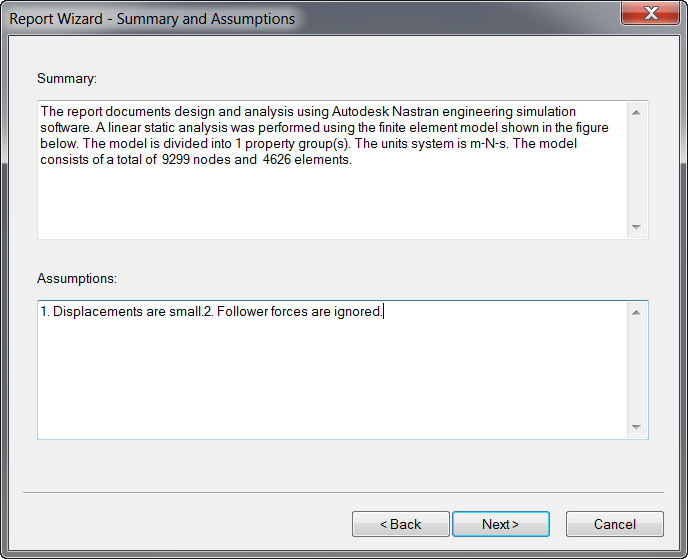 Das Dialogfeld Berichtsassistent – Zusammenfassung und Annahmen wird angezeigt. Fügen Sie im Fenster Annahmen den folgenden Text hinzu: 3. Effects of gravity are negligible. Klicken Sie auf Weiter>.