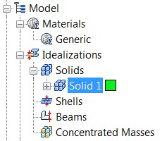 - Überprüfen Sie in der Modellstruktur unter Idealisierungen, ob unter den Standardkategorien Definitionen wie Volumenkörper und Schalen vorhanden sind. Der unten gezeigte Volumenkörper 1 ist ein Beispiel für eine vorhandene Definition: