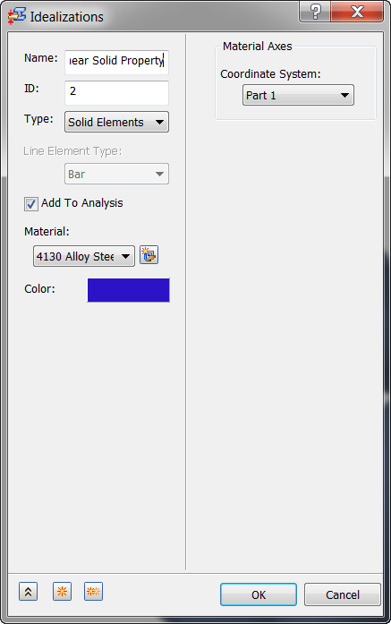 - Geben Sie Lineare Volumenkörpereigenschaft für Name ein, und wählen Sie Festkörperelemente unter Typ und 4130 legierter Stahl unter Material.
