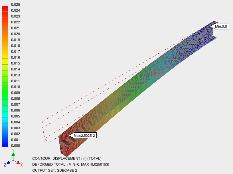 Überprüfen Sie die Verformungs- und Konturdarstellung des Trägers unter der Last X-Verschiebung durch Doppelklicken auf die Verschiebungs-Ergebnisse unter Subcase 2.