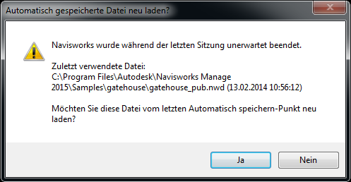 - Starten Sie Autodesk Navisworks. Sie werden automatisch gefragt, ob die zuletzt bearbeitete Datei neu geladen werden soll.