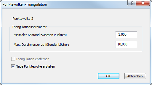 - Wählen Sie das Kontrollkästchen Neue Punktewolke erstellen aus, um das ursprüngliche Punktewolken-Element zu erhalten und die triangulierte Wolke als neues Element zu speichern.