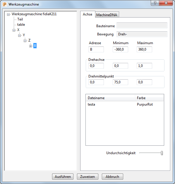 Bewegung – Zeigt die zulässige Bewegung der gewählten Achse an. Maschinenteile werden nach der von ihnen ausgeführten Art der Bewegung klassifiziert. Dies wird von der .mtd-Datei festgelegt und kann hier nicht editiert werden. Diese sind: