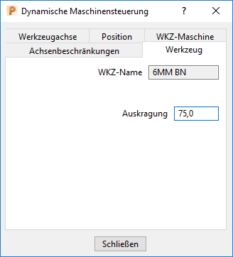 Der Werkzeug-Registerkarte auf dem Dynamische Maschinensteuerung-Modusdialog ermöglicht es Ihnen, das von Ihnen verwendete Werkzeug zu bearbeiten.