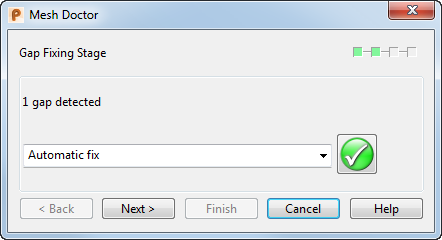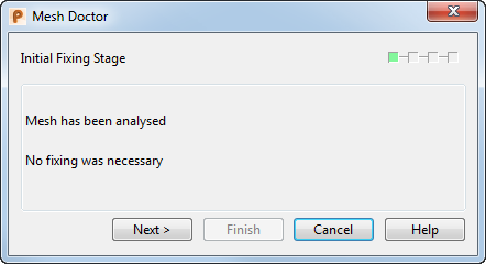 Das Stadium 'Anfängliche Reparatur' analysiert und repariert topologische Fehler, und stellt so sicher, dass das Netz in PowerShape verwendet werden kann. Außerdem wird die Anzahl der durchgeführten Reparaturen angezeigt.